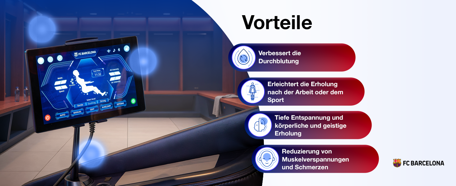 -50% 4.999,99 €PLATINUM 9D, der offizielle Massagesessel des FC Barcelona, kombiniert das Design des Vereins mit modernster Entspannungstechnologie: 15 Programme, 3D-Massage, 360°-Airbags, Schwerelosigkeit, therapeutische Wärme und KI-Scan für ein professionelles und vollständig personalisiertes Erlebnis