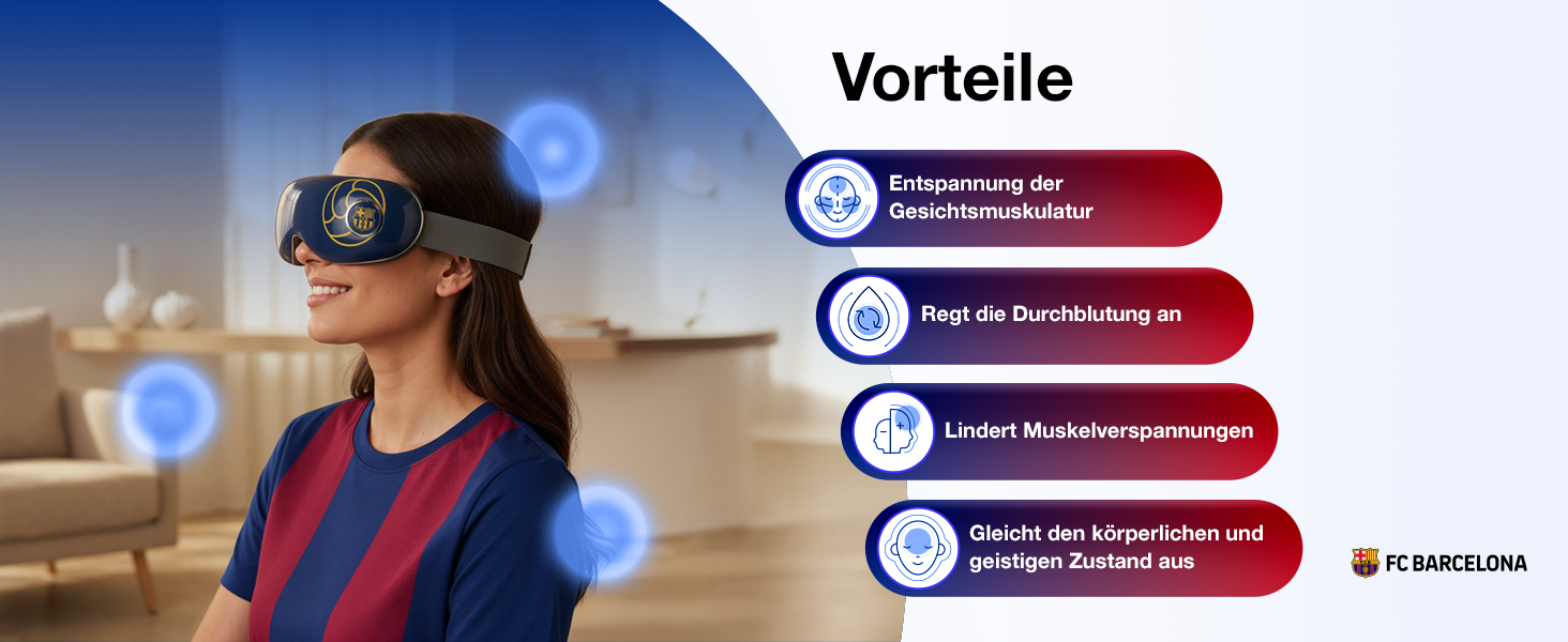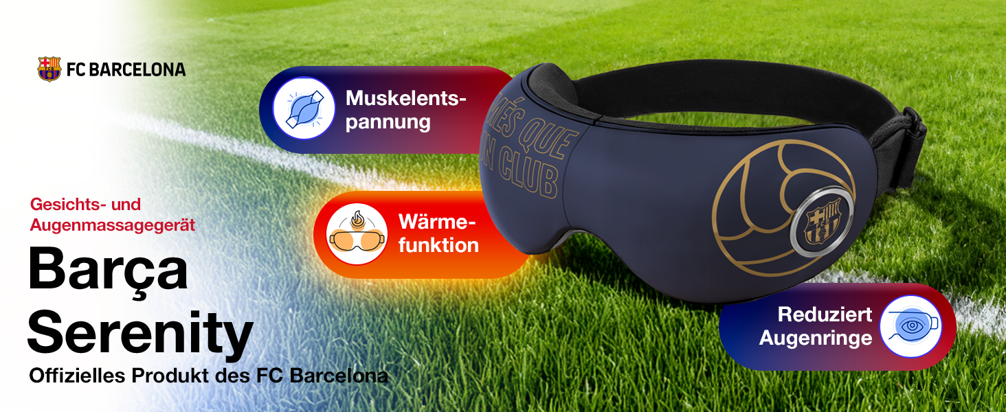 -50% 99,99 €Der SERENITY Augenmassagegerät – offizielles Produkt des FC BARCELONA, bietet ein elegantes und tragbares Design mit 4 Massagearten (Druck, Wärme, Vibration und Musik) sowie 5 voreingestellten Modi. Darüber hinaus verfügen diese Massagebrillen über integrierte Lautsprecher, um die offizielle BARÇA-Hymne in digitalem 3D-Sound zu hören