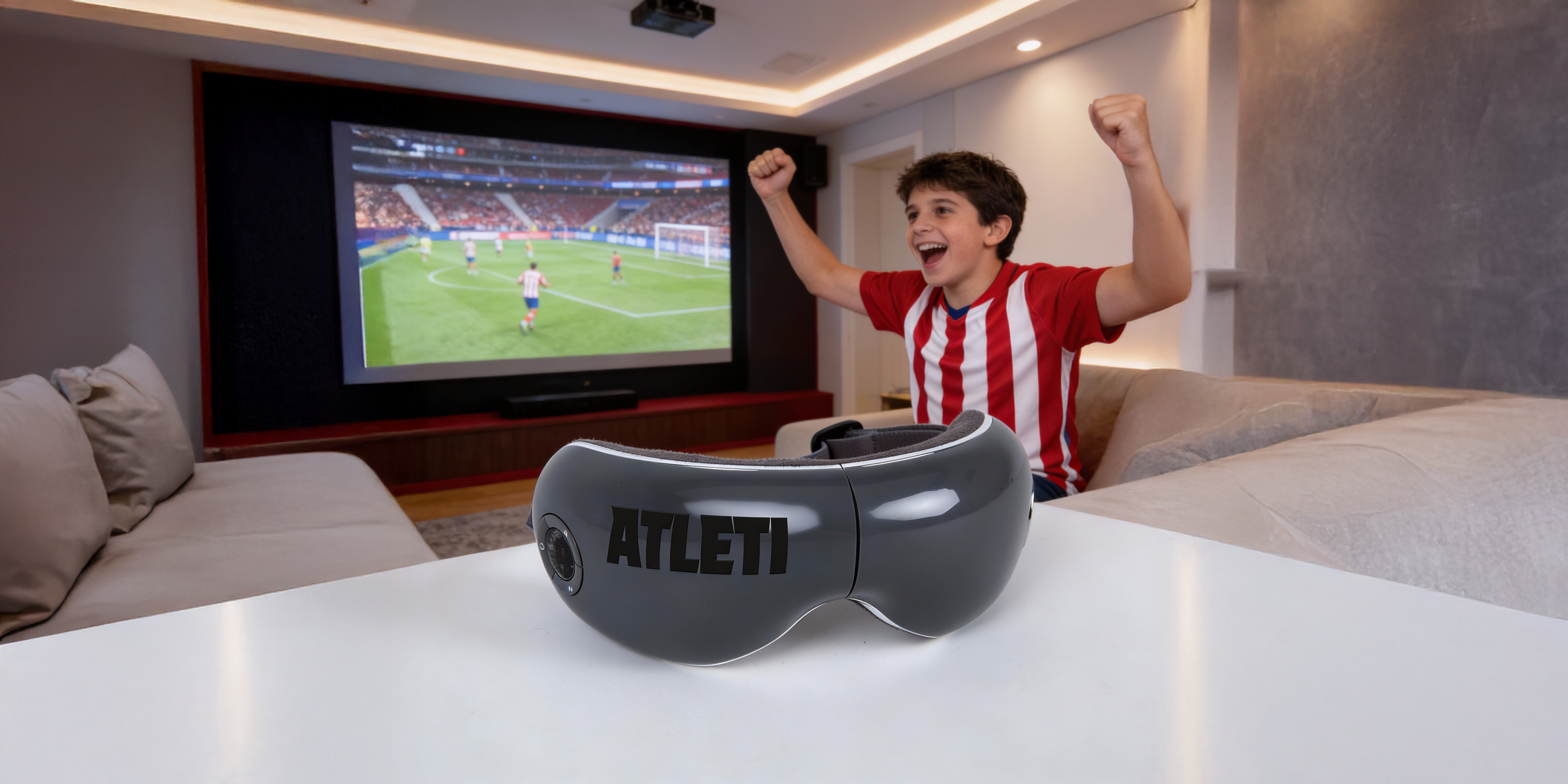 Las gafas de masaje VISION ATLETI - Producto oficial Club Atletico Madrid tienen grabado tanto el escudo del Club como el grito de ánimo de todos los Colchoneros. Además, puedes escuchar tu musica favorita, para que rememores los momentos épicos de tu equipo mientras te relajas