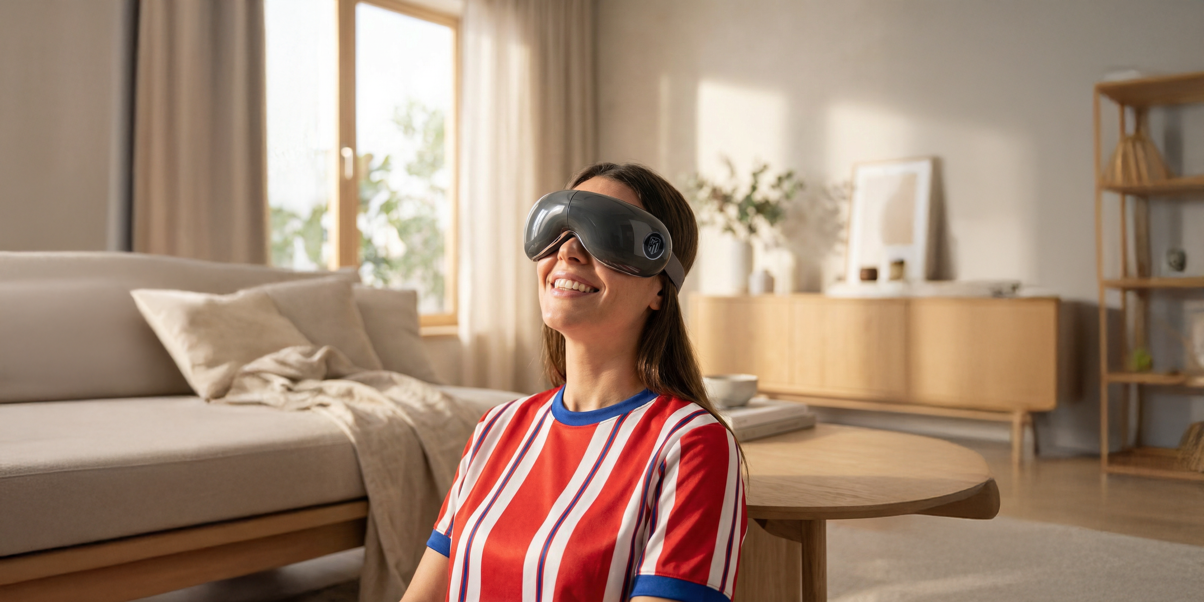 -50% 99,99 €El masajeador de ojos VISON ATLETI - Producto oficial del Club ATLETICO de MADRID, ofrece un diseño elegante y portátil con 4 tipos de masaje (presión térmico vibración y musical) y 5 modos predefinidos. Además, estas gafas de masaje incluyen altavoces integrados, para escuchar en sonido 3D digital tus canciones favoritas