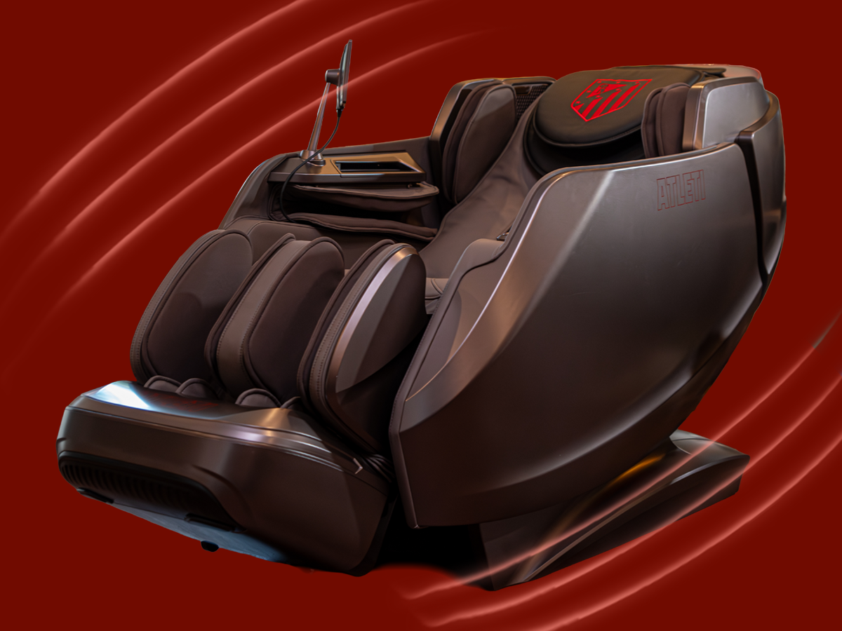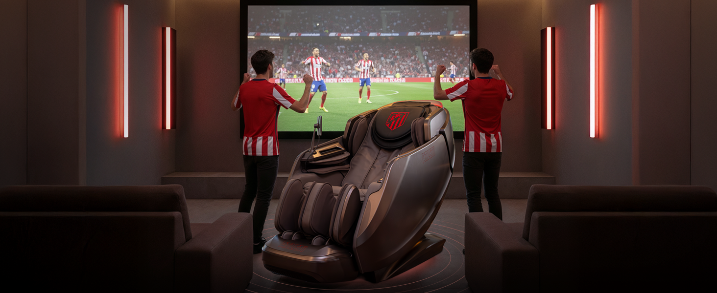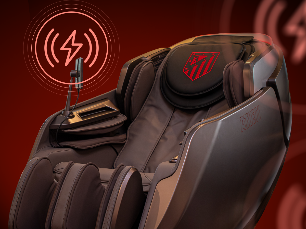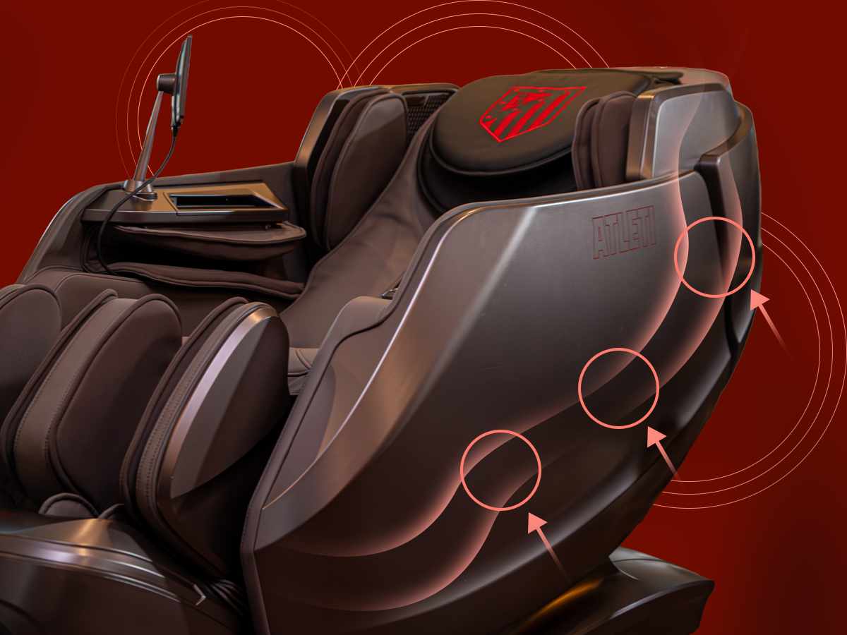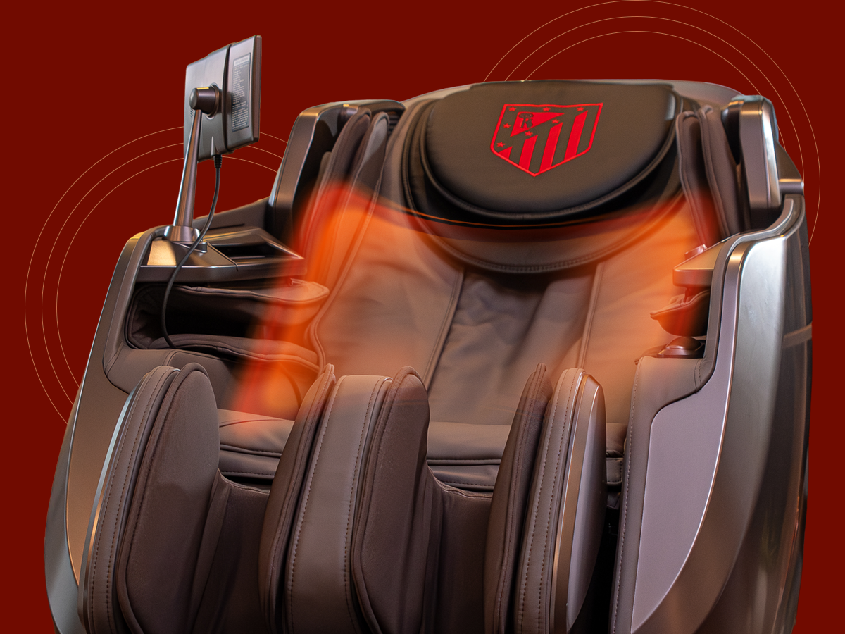 Diseño envolvente tipo cápsula con escaneo corporal, sensor de salud, control por voz, audio 3D, pantalla táctil y cargador inalámbrico. Un sillón oficial del Atlético de Madrid pensado para bienestar diario de alto nivel