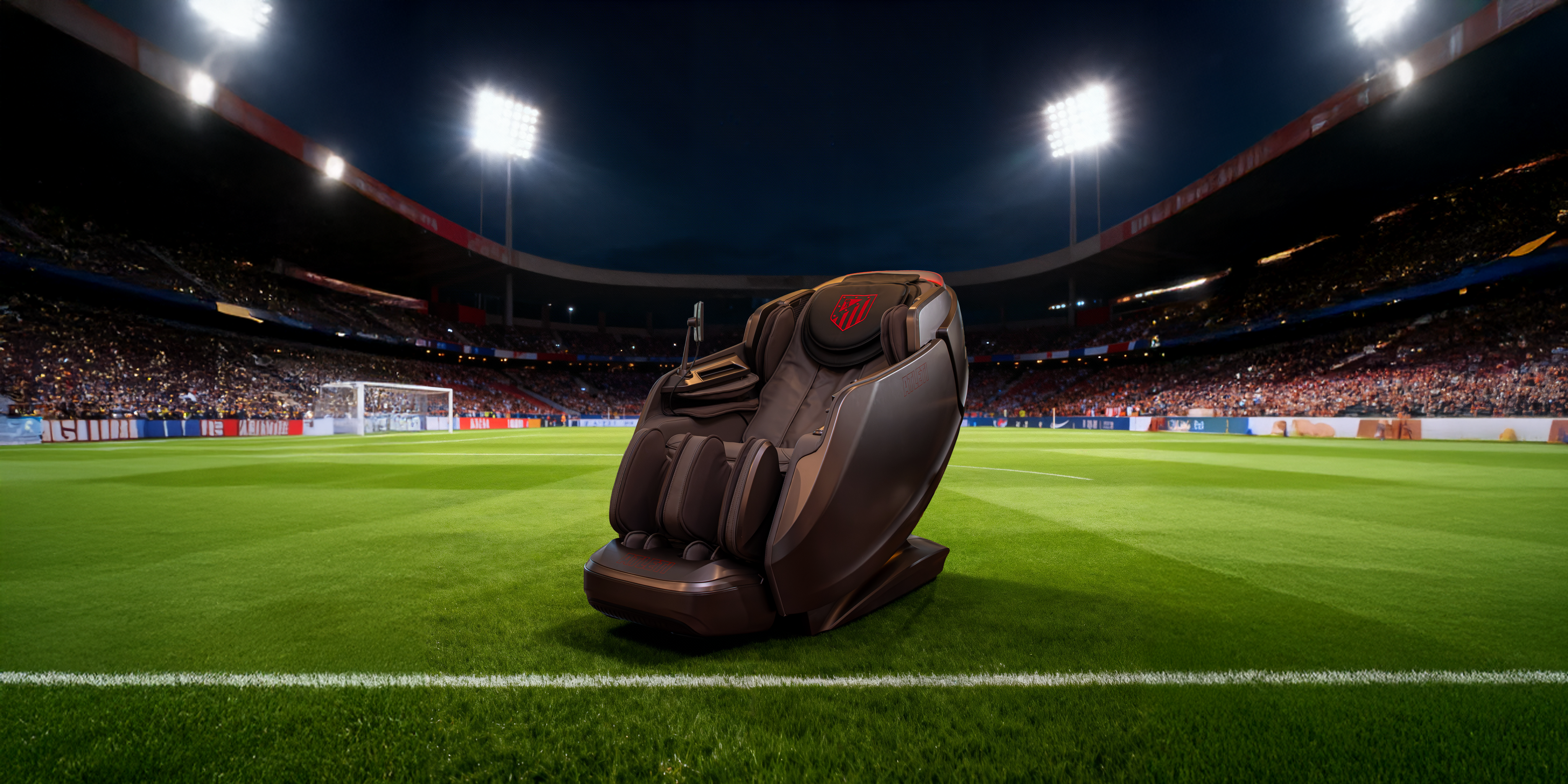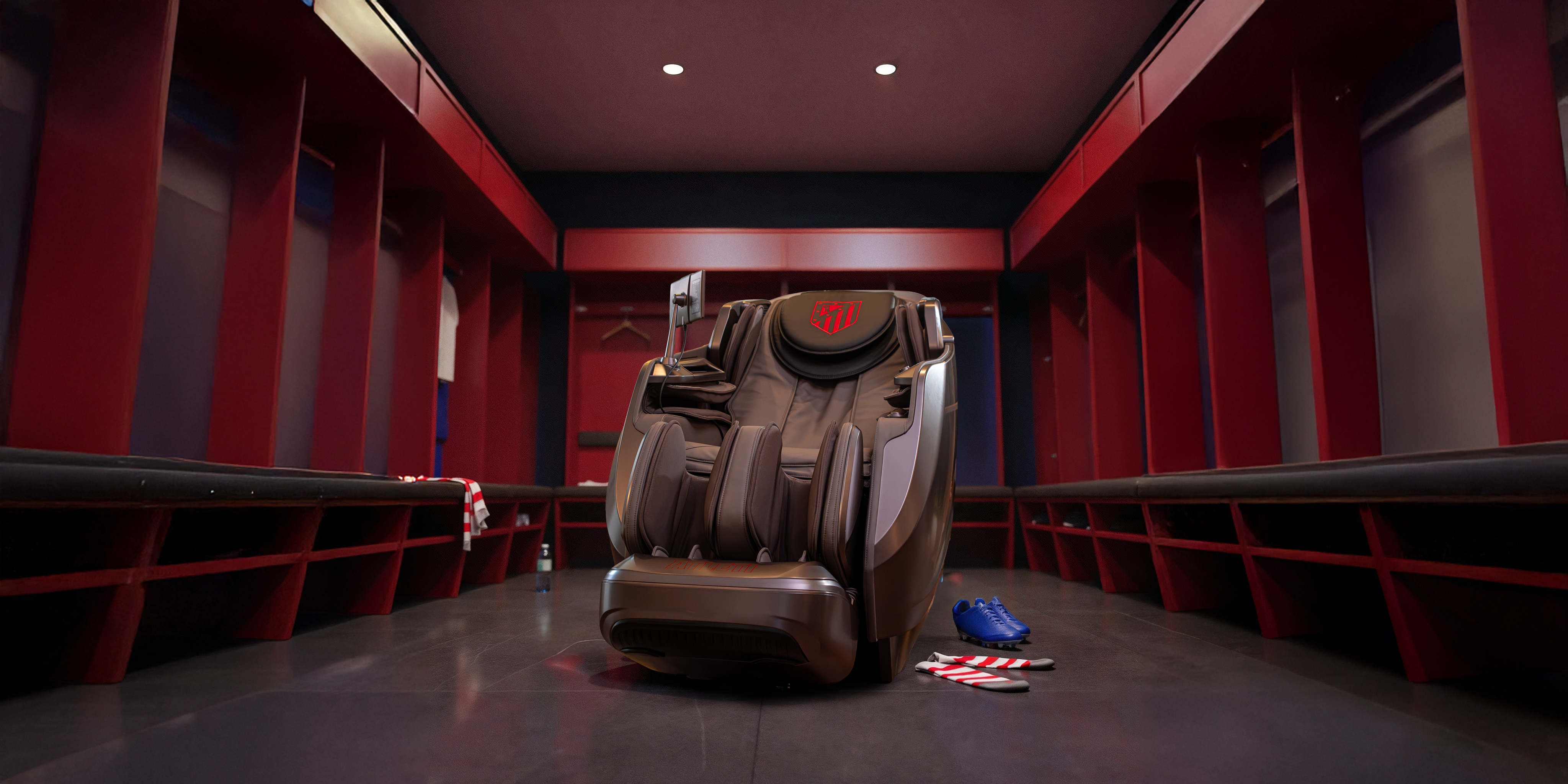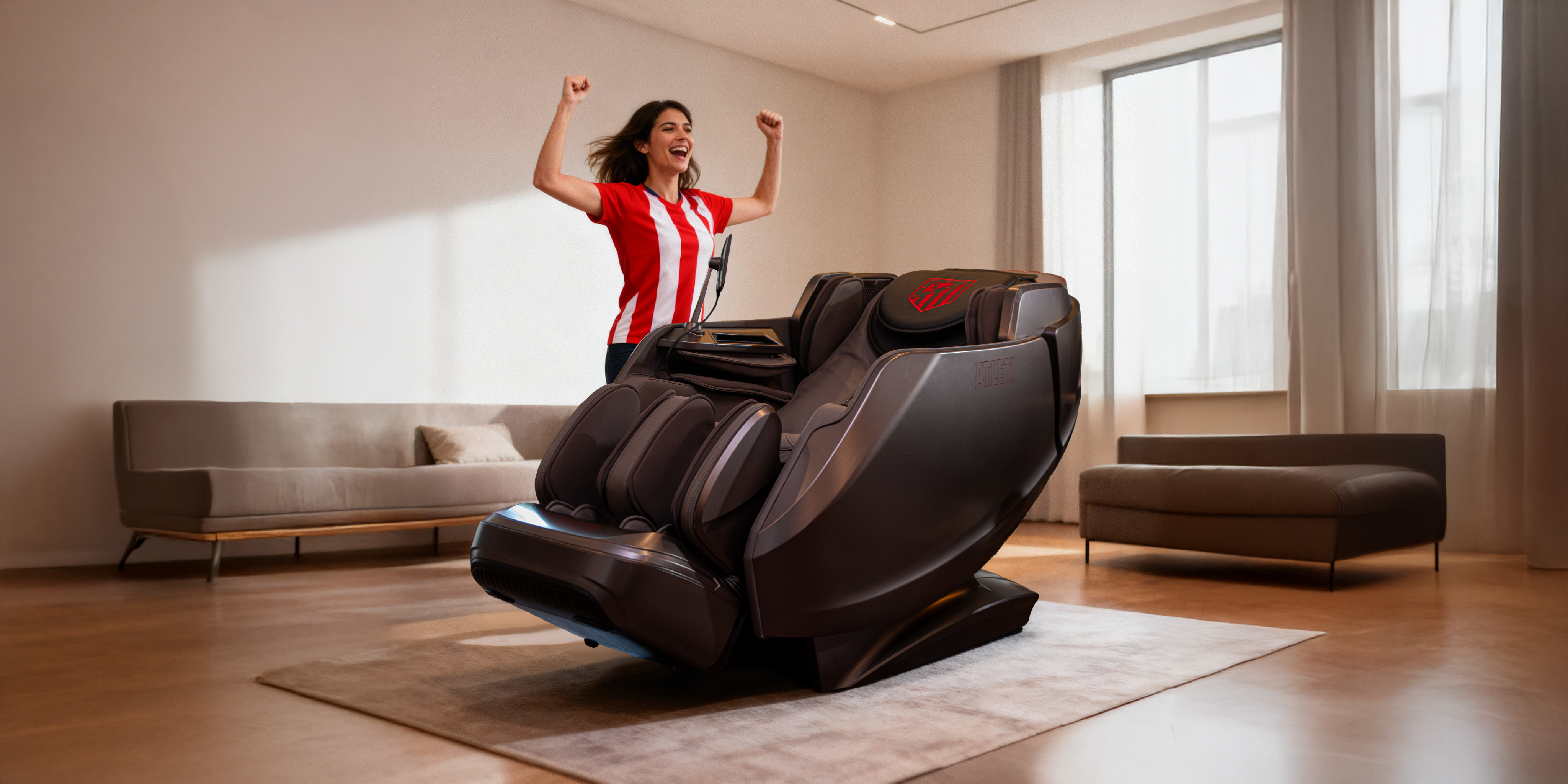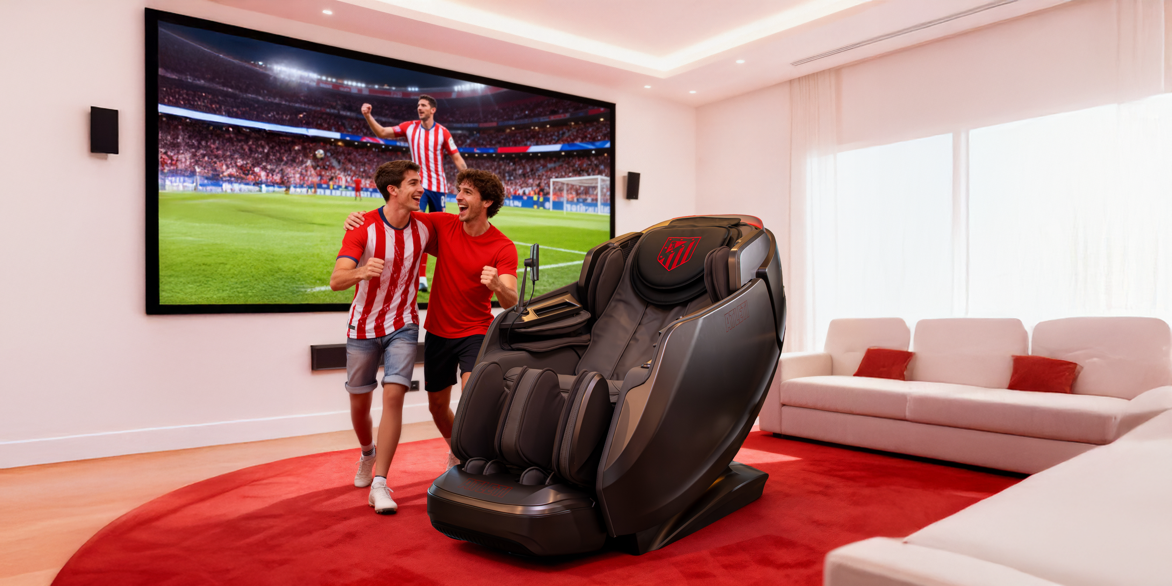 Diseño envolvente tipo cápsula con escaneo corporal, sensor de salud, control por voz, audio 3D, pantalla táctil y cargador inalámbrico. Un sillón oficial del Atlético de Madrid pensado para bienestar diario de alto nivel