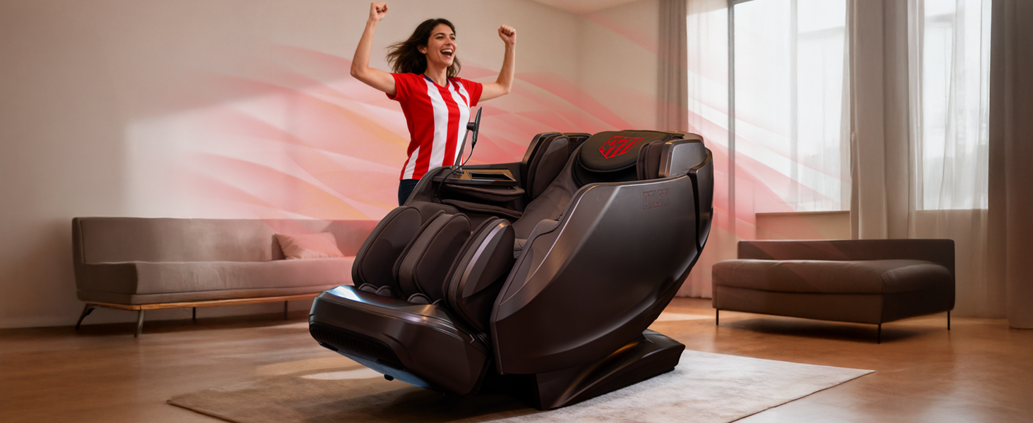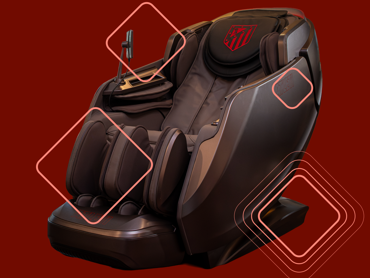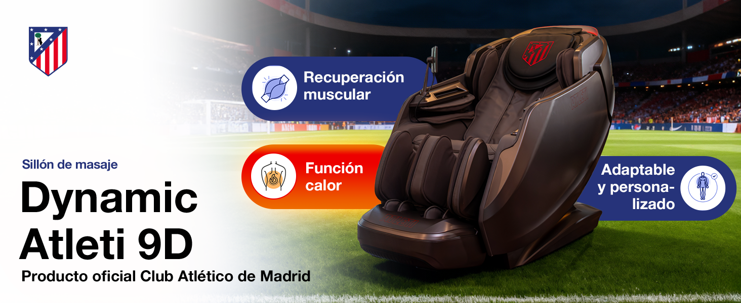 El Sillón de masaje DYNAMIC ATLETI 9D - Producto oficial Club ATLETICO de MADRID, ofrece un masaje 4D con doble mecanismo, airbags de cuerpo completo, calor lumbar y en pies, 20 programas inteligentes, gravedad cero, control por voz, audio 3D y máxima personalización para una relajación total y rendimiento premium