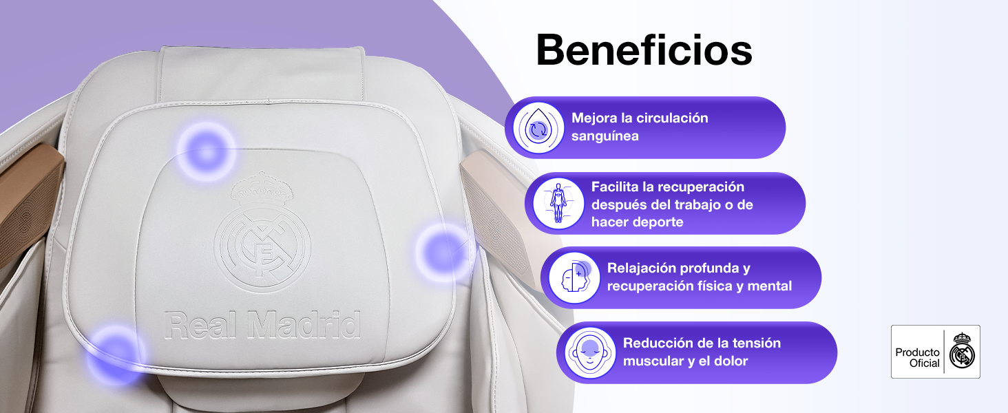 Incorpora temporizador ajustable y diseño exclusivo con logos del club en reposabrazos y respaldo, ideal para tu zona de descanso