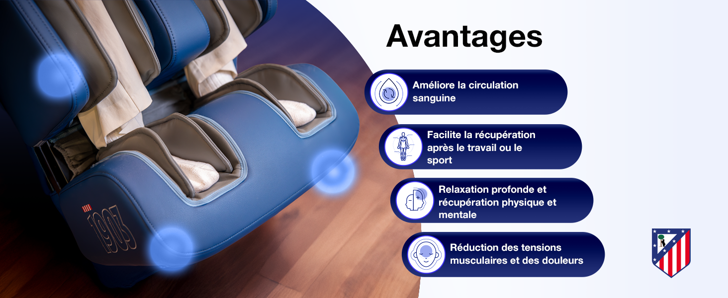 Les coussins d'air agissent sur les hanches, les cuisses, les jambes et les pieds, stimulant la circulation, soulageant la sensation de lourdeur et favorisant une récupération efficace après de longues heures passées assis ou debout