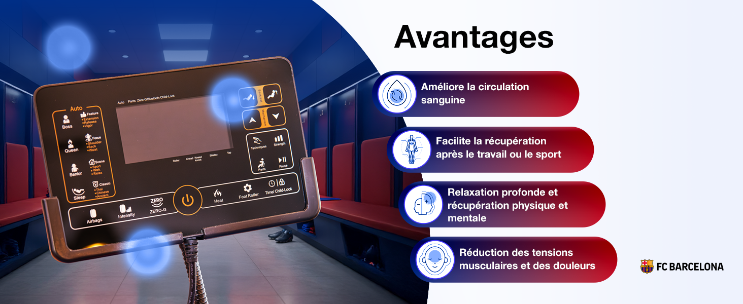 Fauteuil de massage INSPIRE 3D officiel du FC BARCELONE, combinant 16 programmes automatiques, un massage manuel personnalisable, la gravité zéro, la thermothérapie et le massage des pieds pour offrir une expérience de récupération complète. Avec écran LCD couleur, airbags à 3 intensités, Bluetooth et verrouillage enfant, il garantit une relaxation profonde, un soulagement musculaire et un bien-être quotidien à la maison avec le label officiel du FC Barcelone