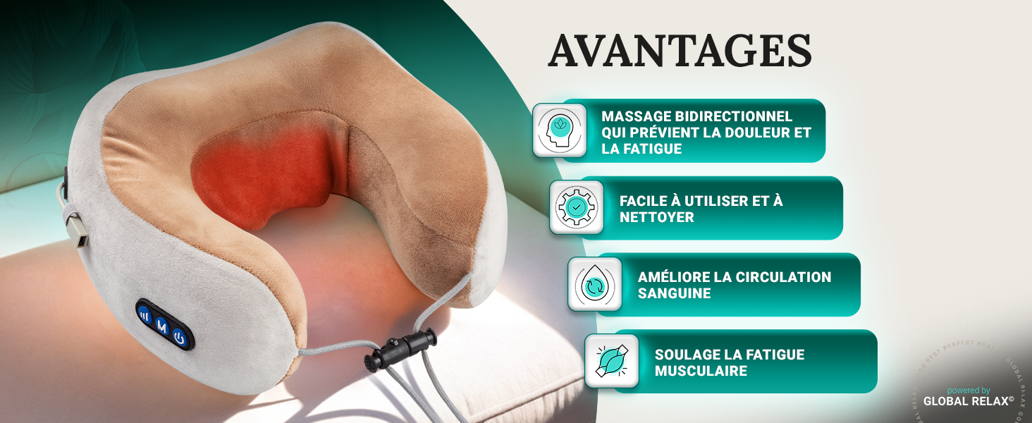 - Conception ergonomique et enveloppante pour un massage confortable, précis et agréable