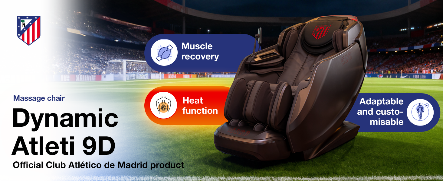 -65% €3,499.99The DYNAMIC ATLETI 9D massage chair – an official product of Club Atlético de Madrid, offers a 4D massage with a dual mechanism, full-body airbags, lumbar and foot heat, 20 intelligent programmes, zero gravity, voice control, 3D audio and maximum customisation for total relaxation and premium performance