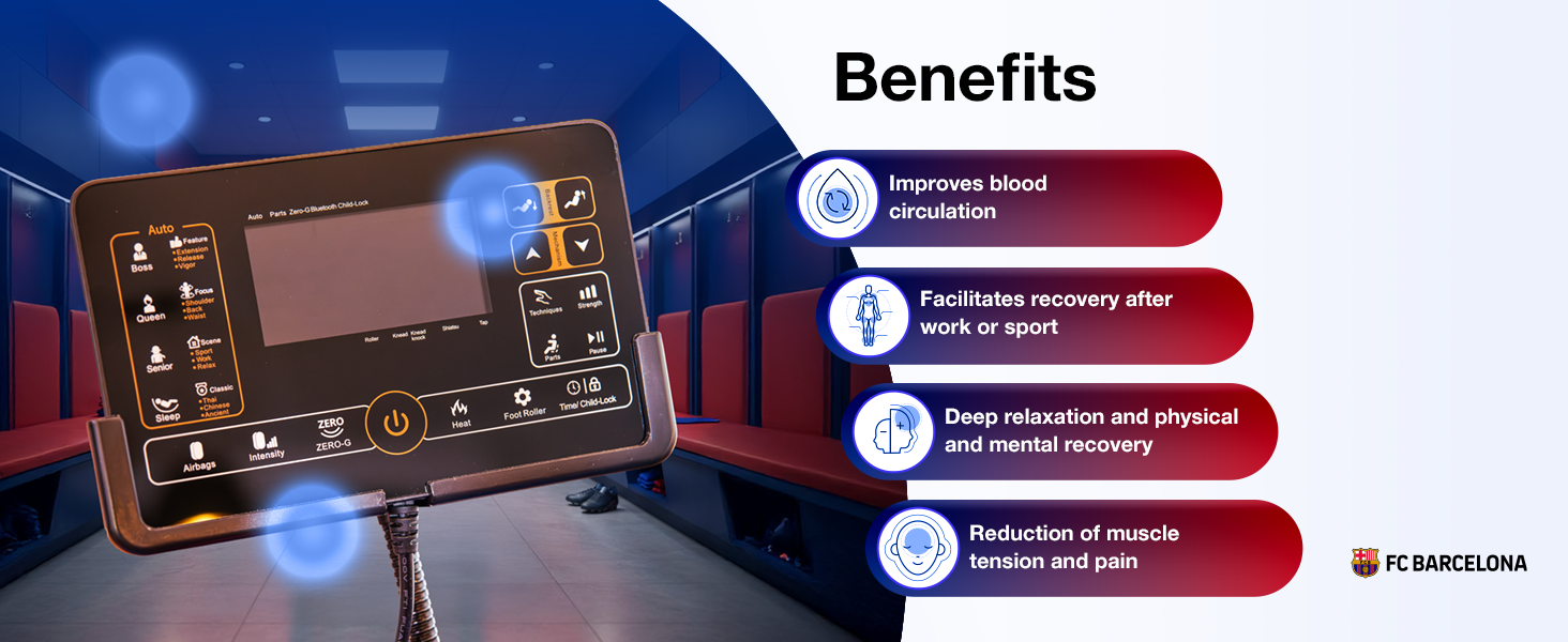 El sillón de masaje Barça Inspire 3D integra 16 programas automáticos para bienestar, alivio del estrés, sueño profundo y recuperación deportiva.