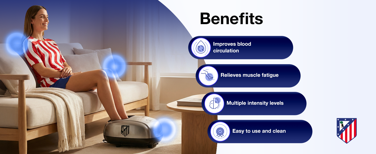 The RELAX ATLETI foot massager – an Official Product of Club Atlético de Madrid – combines compression from 60 airbags, Shiatsu massage, vibration and infrared heat to stimulate circulation and relieve fatigue
