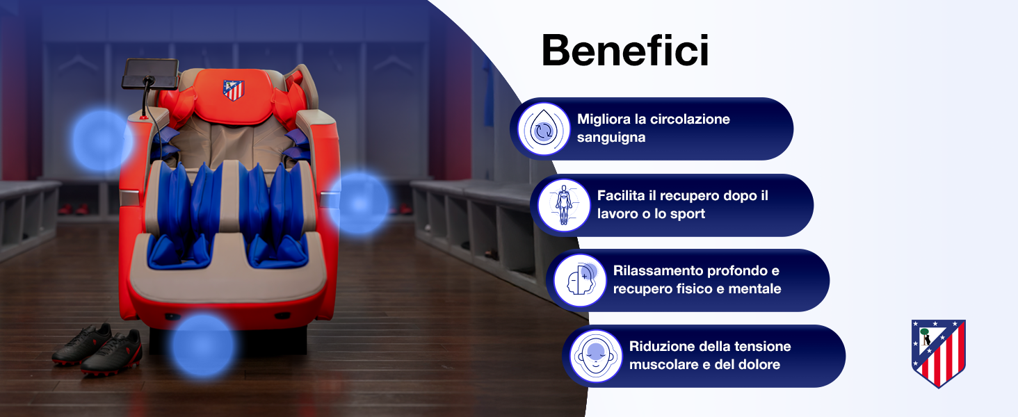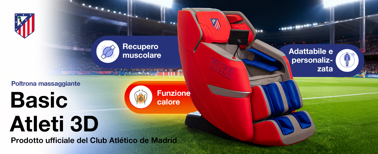 -50% 1.999,99 €La poltrona massaggiante BASIC ATLETI 3D – Prodotto ufficiale del Club Atlético de Madrid, offre un massaggio 3D completo con airbag corporei, modalità Gravità Zero, 16 programmi automatici, regolazione dell'intensità, poggiapiedi estensibile e Bluetooth. Ideale per alleviare le tensioni, recuperare energia e rilassarsi ogni giorno