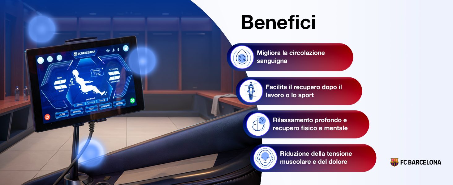 -50% 5.299,97 €PLATINUM 9D, la poltrona massaggiante ufficiale del FC Barcelona, combina un design culé con la più avanzata tecnologia di rilassamento: 15 programmi, massaggio 3D, airbag a 360°, gravità zero, calore terapeutico e scansione AI per un'esperienza professionale e totalmente personalizzata