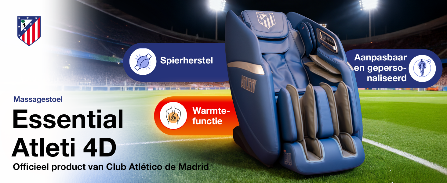 -50% € 2.499,99De Essential Atleti 4D-massagestoel - Officieel product van Club ATLETICO de MADRID, biedt een eersteklas ervaring van ontspanning en herstel, met meerdere automatische en handmatige programma's, 4D-massage, warmte, lucht voor benen en voeten, slimme spraakbesturing en Bluetooth, ideaal voor het verlichten van stress en vermoeidheid en het verbeteren van de bloedsomloop in het hele lichaam