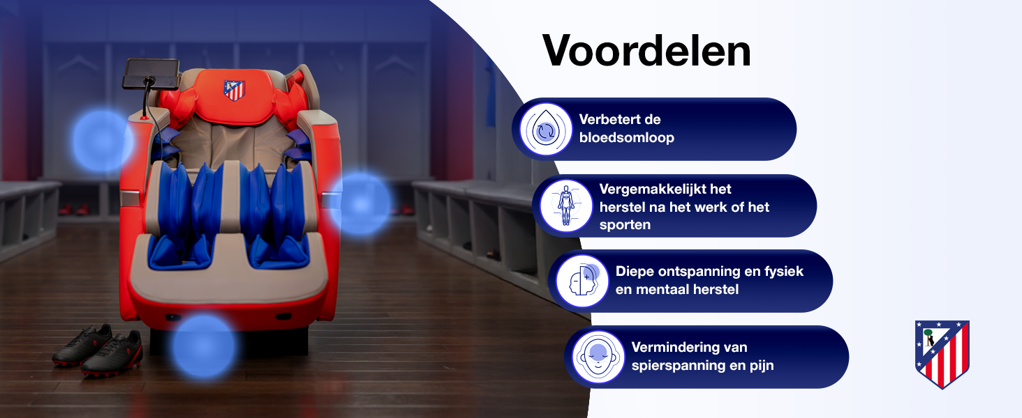 -50% € 1.999,99De BASIC ATLETI 3D-massagestoel – Officieel product van Club Atlético de Madrid, biedt een complete 3D-massage met lichaamsairbags, Zero Gravity-modus, 16 automatische programma's, intensiteitsregeling, uitschuifbare voetensteun en Bluetooth. Ideaal om spanningen te verlichten, energie terug te winnen en dagelijks te ontspannen