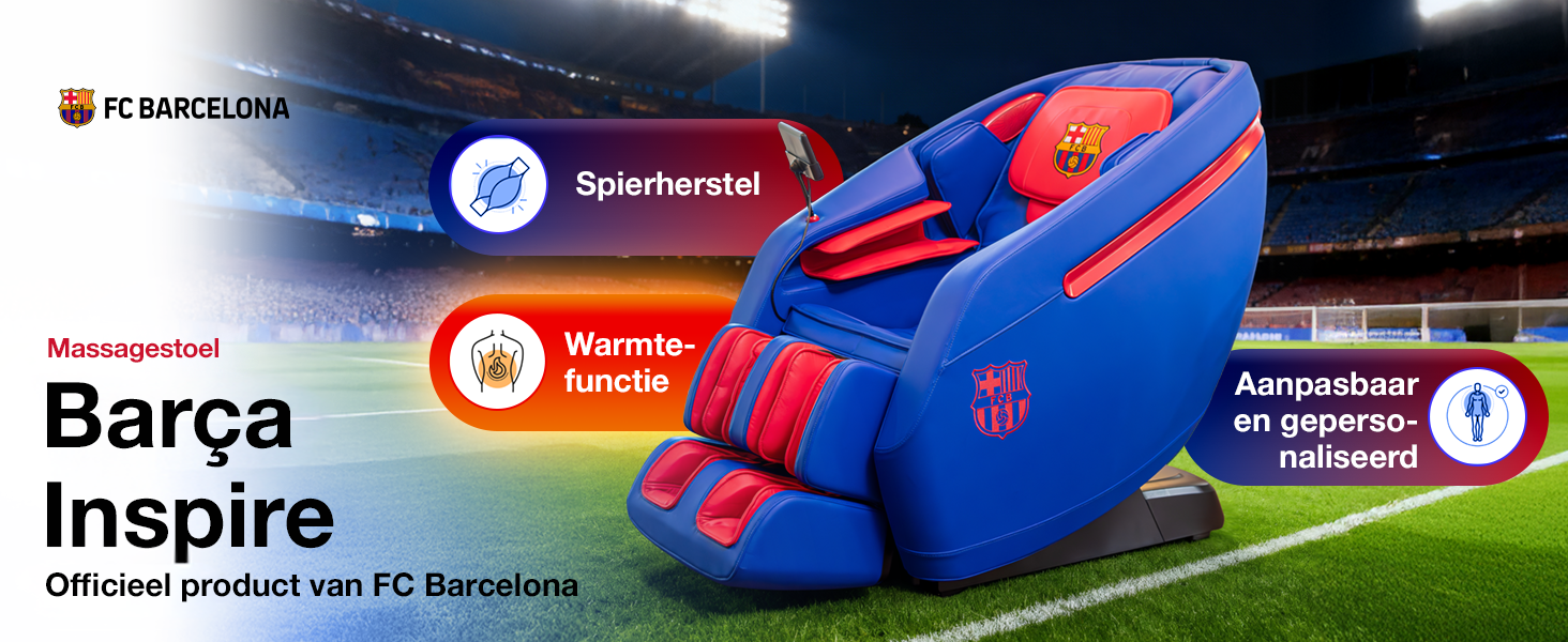 -50% € 2.299,98INSPIRE 3D Officiële massagestoel van FC BARCELONA, combineert 16 automatische programma's, aanpasbare handmatige massage, Zero Gravity, thermotherapie en voetmassage voor een complete herstelervaring. Met kleuren-LCD-scherm, airbags met 3 intensiteiten, Bluetooth en kinderslot, garandeert deze stoel diepe ontspanning, spierverlichting en dagelijks welzijn thuis met het officiële keurmerk van FC Barcelona