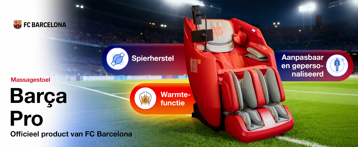 -40% € 2.999,99PRO 4D, de officiële massagestoel van FC Barcelona, biedt een volledige massage van top tot teen met SL Hyperbola-rail, mechanische 4D-handen met AI, zero gravity, koolstof-grafeenverwarming en een complete bodyspa met 360º-airbags en Gua Sha-voetreflexologie.