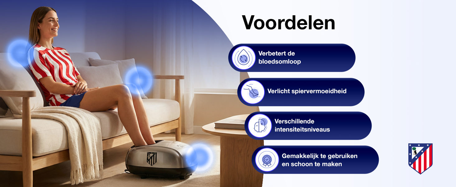De voetmassageapparaat RELAX ATLETI – Officieel product van Club Atlético de Madrid – combineert compressie met 60 luchtkussens, Shiatsu-massage, trillingen en infraroodwarmte om de bloedsomloop te stimuleren en vermoeidheid te verlichten