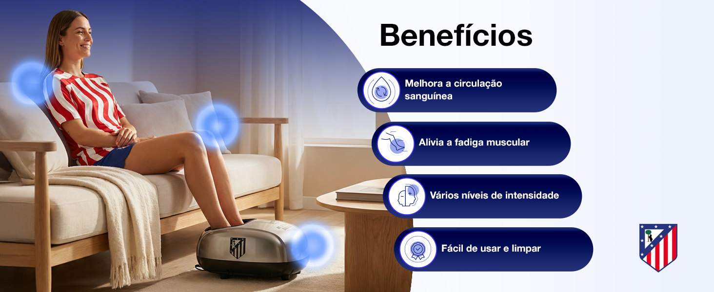 O massageador de pés RELAX ATLETI — Produto Oficial do Club Atlético de Madrid — combina compressão com 60 bolsas de ar, massagem Shiatsu, vibração e calor infravermelho para estimular a circulação e aliviar a fadiga