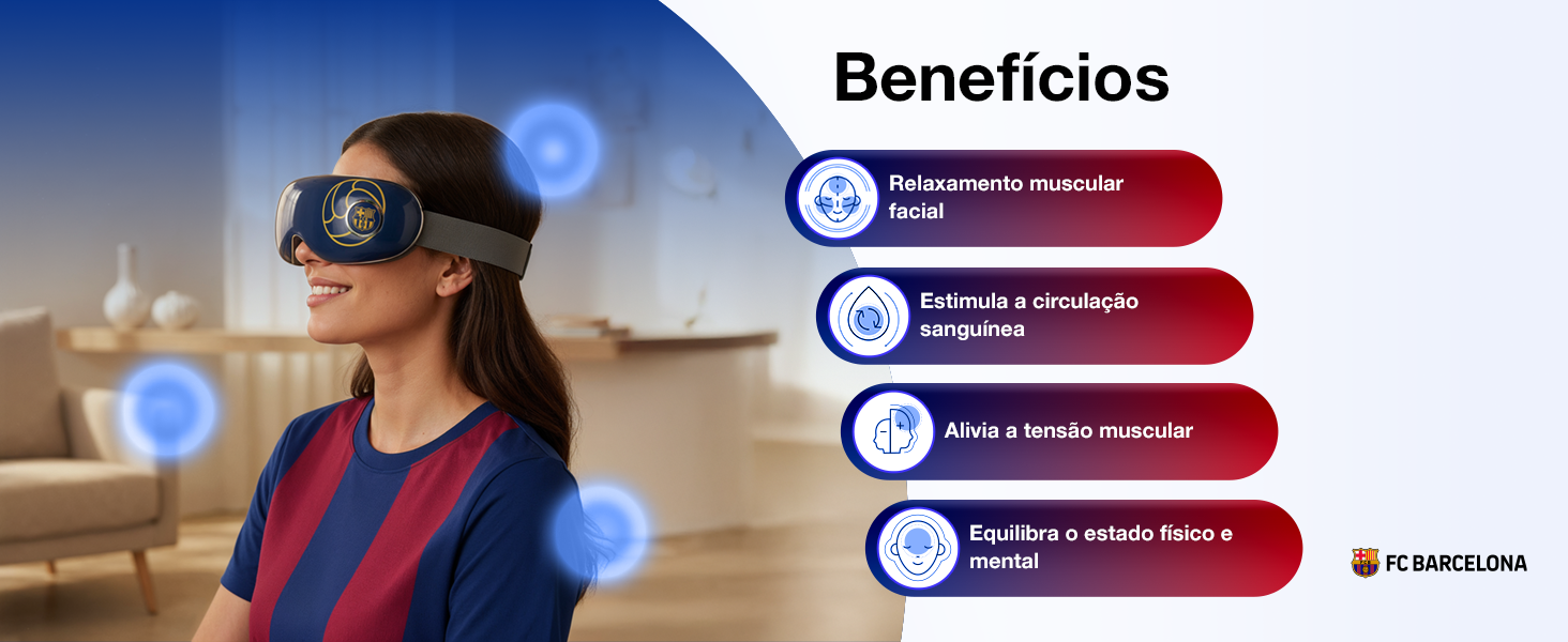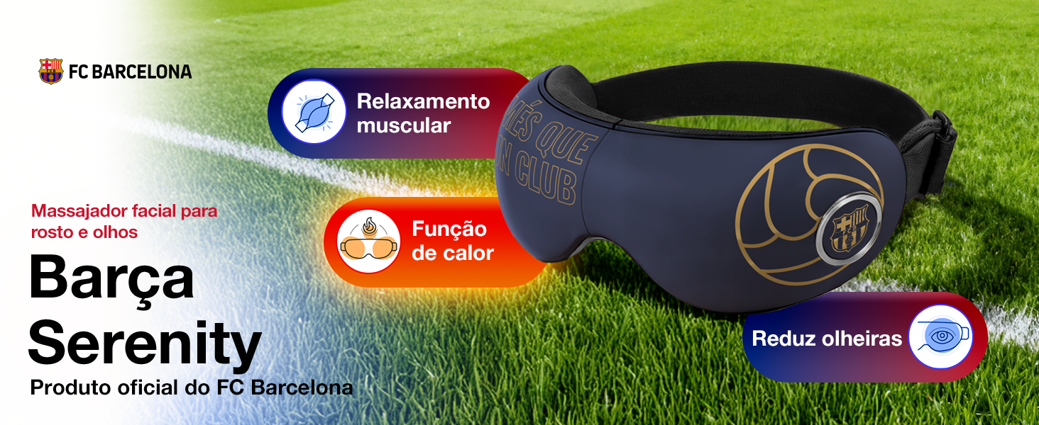 -50% 139,98 €O massageador ocular SERENITY – Produto oficial do FC BARCELONA, oferece um design elegante e portátil com 4 tipos de massagem (pressão, calor, vibração e música) e 5 modos predefinidos. Além disso, estes óculos de massagem incluem altifalantes integrados para ouvir o hino oficial do BARÇA em som digital 3D