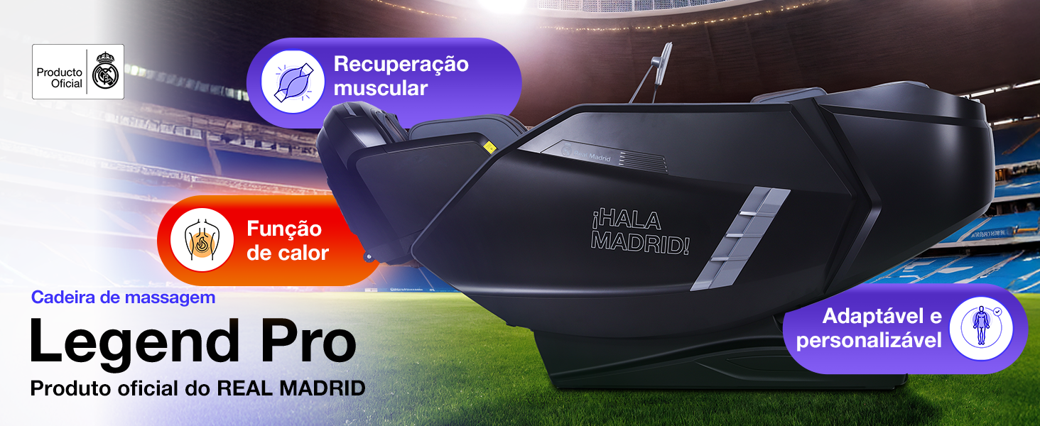 LEGEND Pro 9D tem uma gravação exclusiva do novo estádio do Bernabéu, bem como da lendária claque madridista HALA MADRID! Para além do nome no apoio para os pés e no menu de controlo do telecomando.